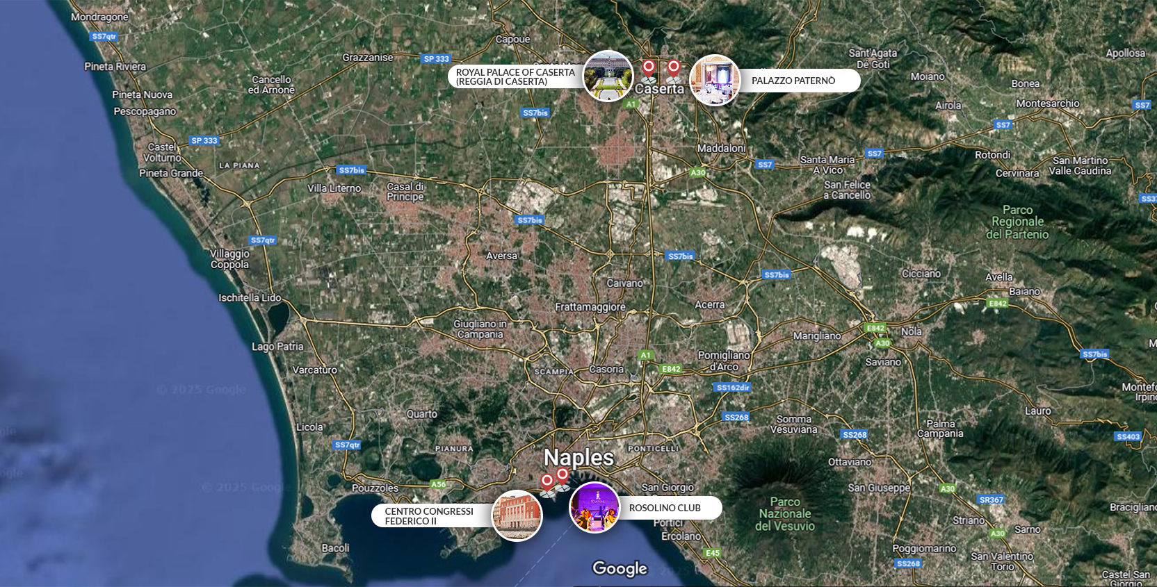 The MedLIFE-26 will be held at the Centro Congressi Federico II (Via Partenope 36, Naples). The MedLIFE-26 Gala Dinner will take place in the Rosolino Club Restaurant (Via Francesco Crispi 33, Naples) on December 9, 2026, at 20:00. The Palazzo Paternò (Via San Carlo, Caserta) will host the MedLIFE Union Annual Dinner on December 10, 2026, at 20:00. The dinner will be preceded on the same day by a visit to the Royal Palace of Caserta (Reggia di Caserta) at 16:30 (see the Scientific Program and Social Program):